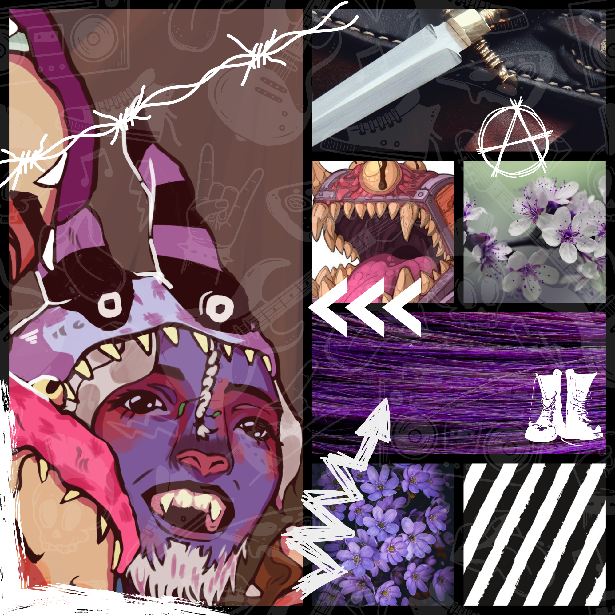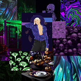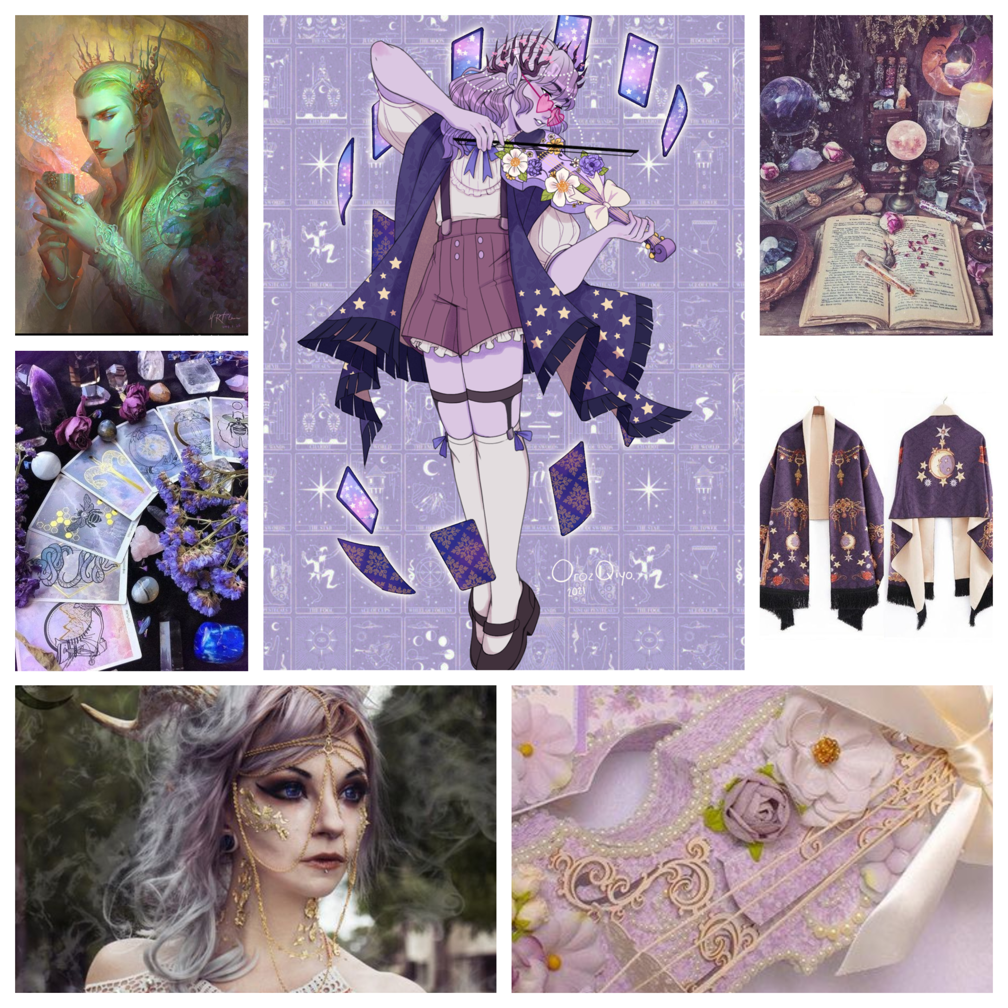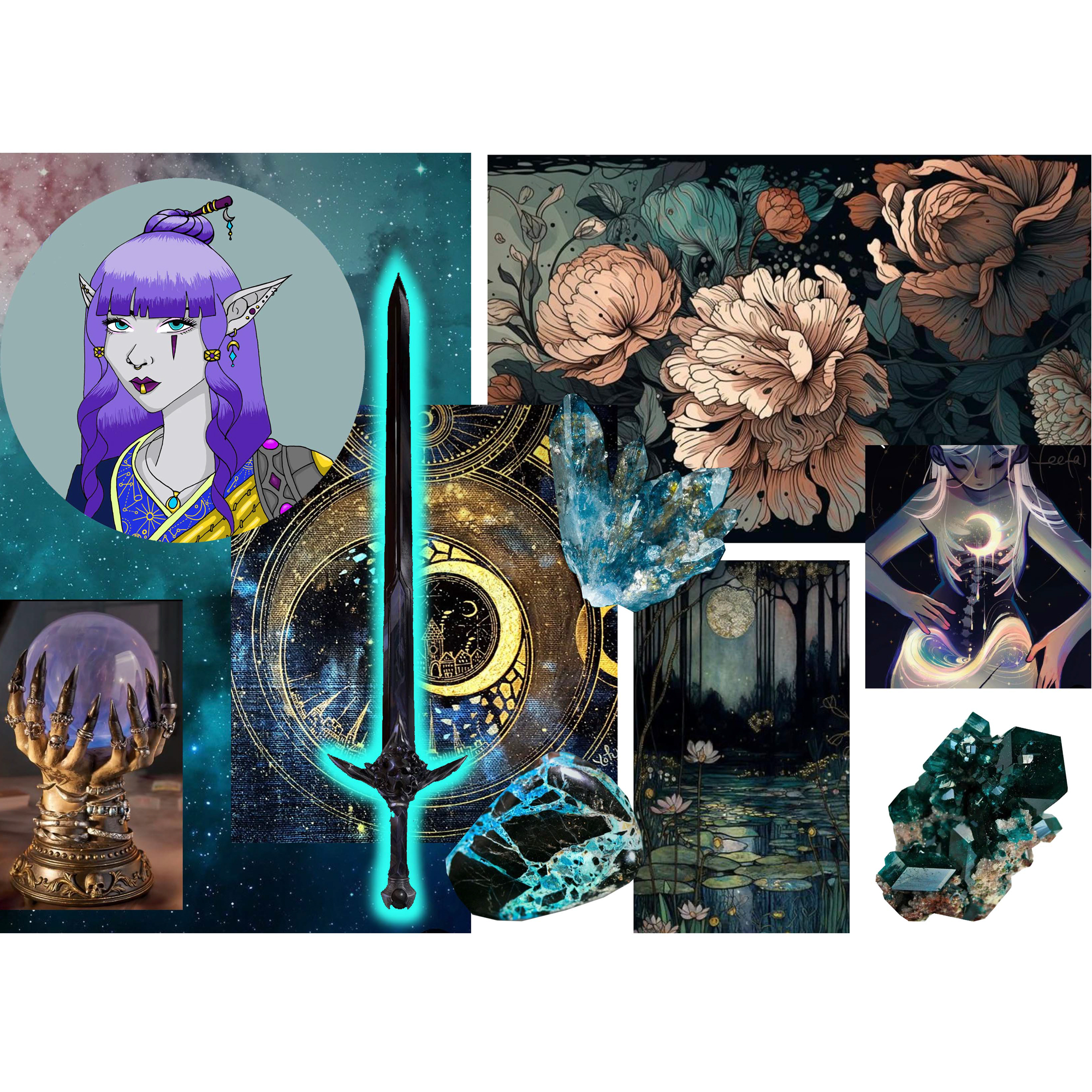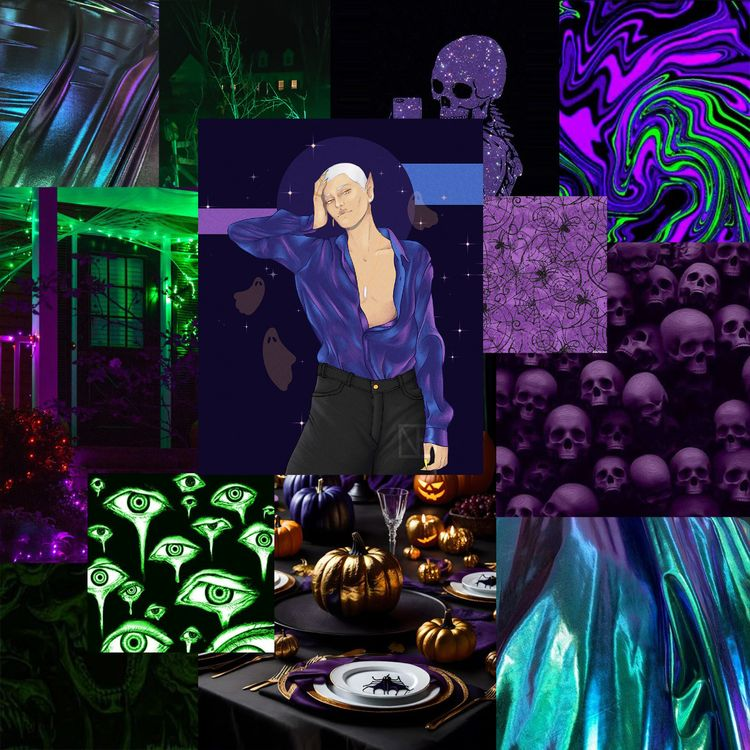 Made for my necromancer bard, this moodboard screams dark Halloween. Bright greens and dark purples feature psychedelic eyes, skulls and skeletons, spiderwebs and Halloween décor. Within are also shimmering colorshift fabrics that shift from greenish blue to purple and a very noble fall/Halloween table with gold and purple décor, a bit of royalty between the darkness.