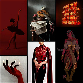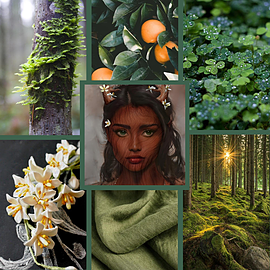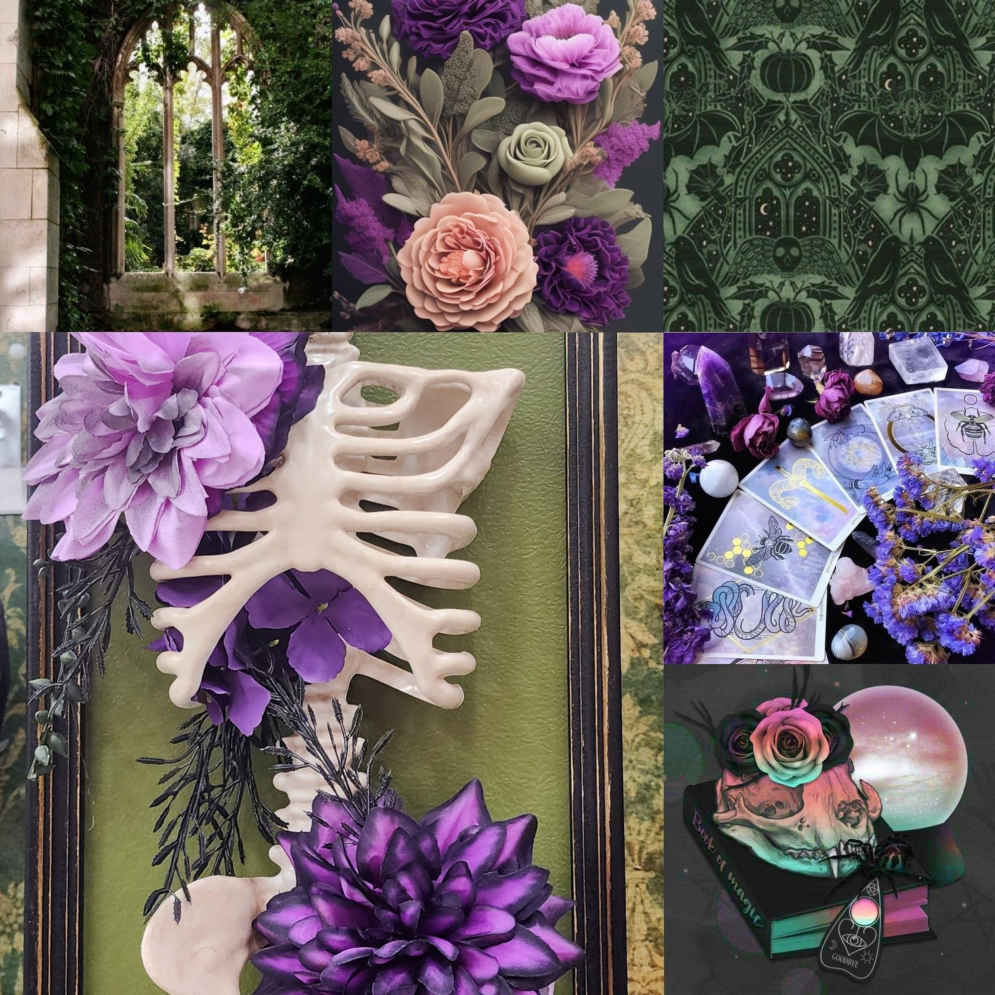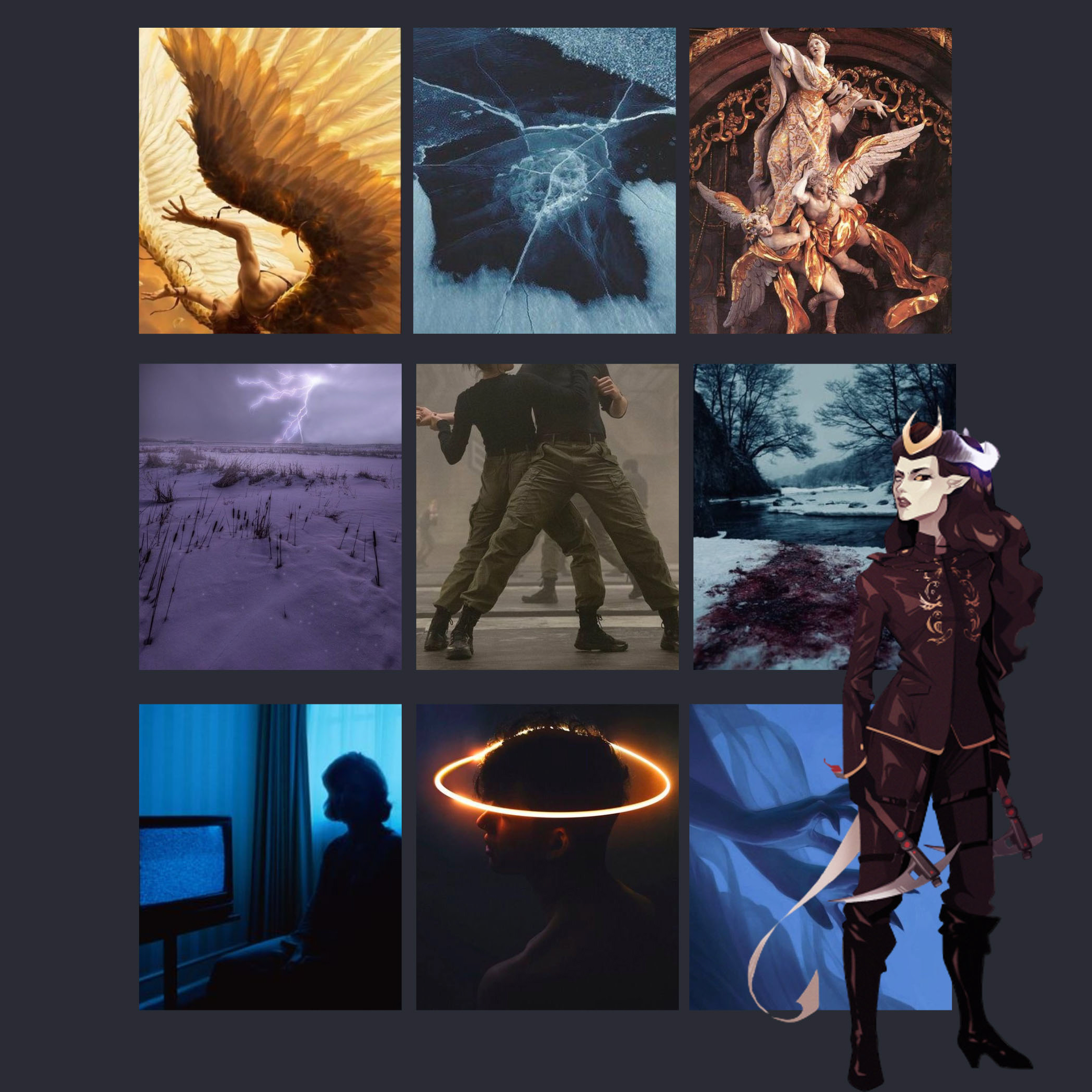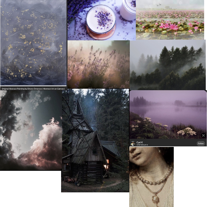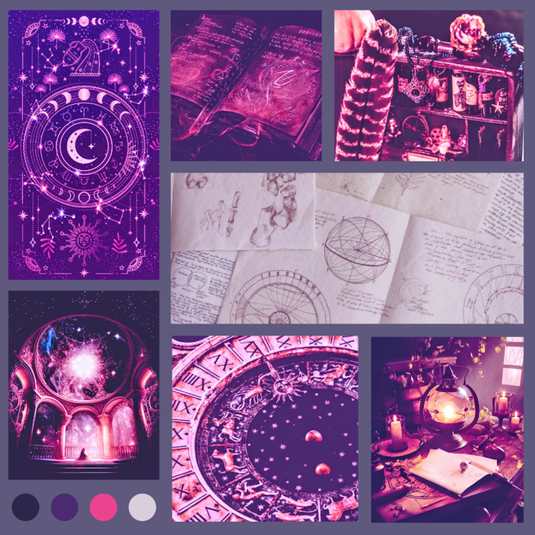 Made for my necromancer bard, this moodboard screams dark Halloween. Bright greens and dark purples feature psychedelic eyes, skulls and skeletons, spiderwebs and Halloween décor. Within are also shimmering colorshift fabrics that shift from greenish blue to purple and a very noble fall/Halloween table with gold and purple décor, a bit of royalty between the darkness.