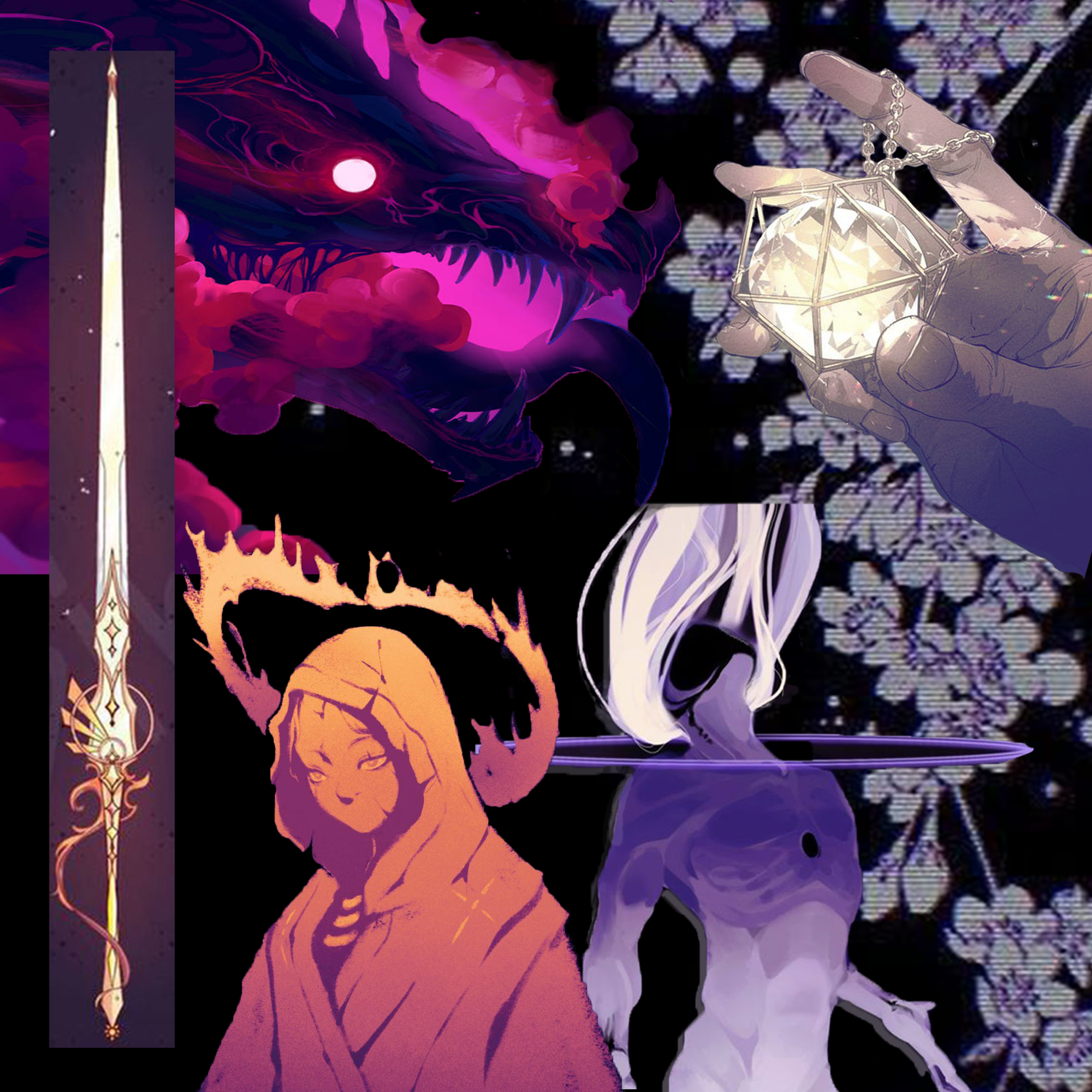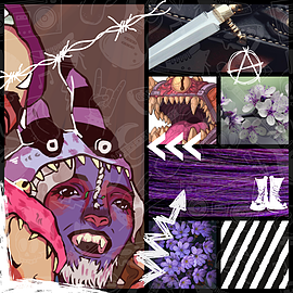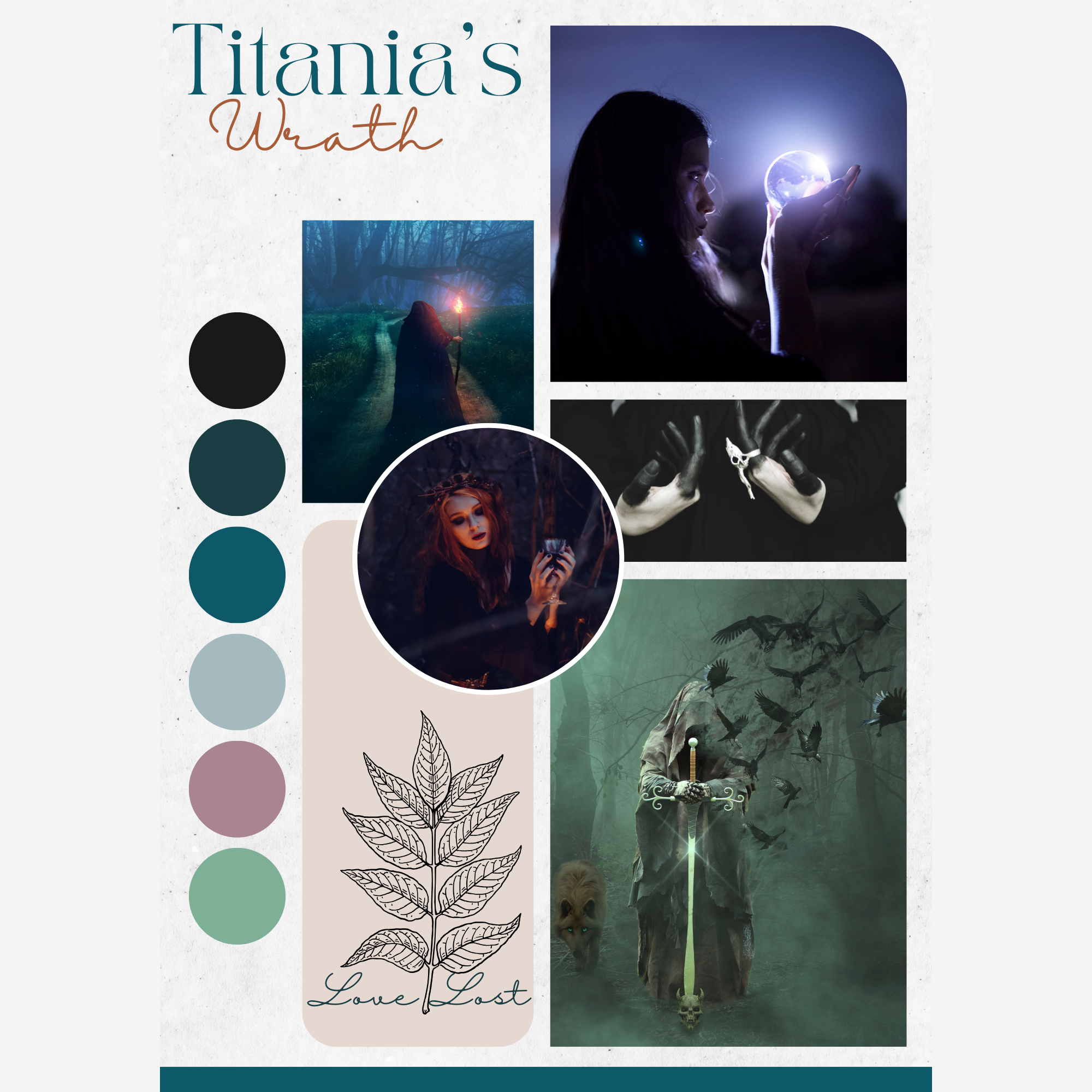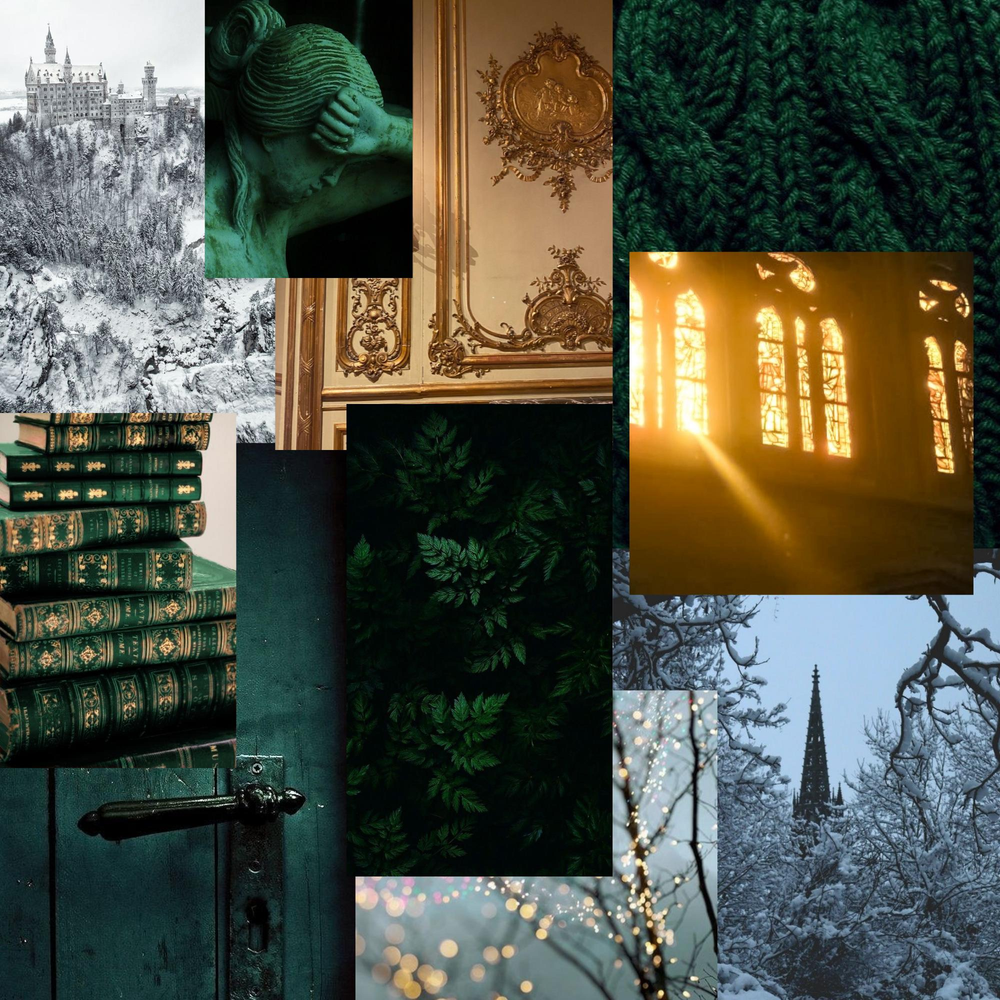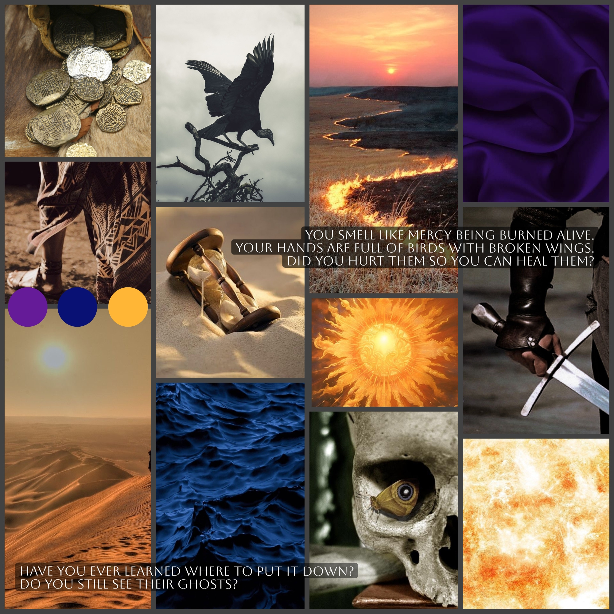 Made for my necromancer bard, this moodboard screams dark Halloween. Bright greens and dark purples feature psychedelic eyes, skulls and skeletons, spiderwebs and Halloween décor. Within are also shimmering colorshift fabrics that shift from greenish blue to purple and a very noble fall/Halloween table with gold and purple décor, a bit of royalty between the darkness.