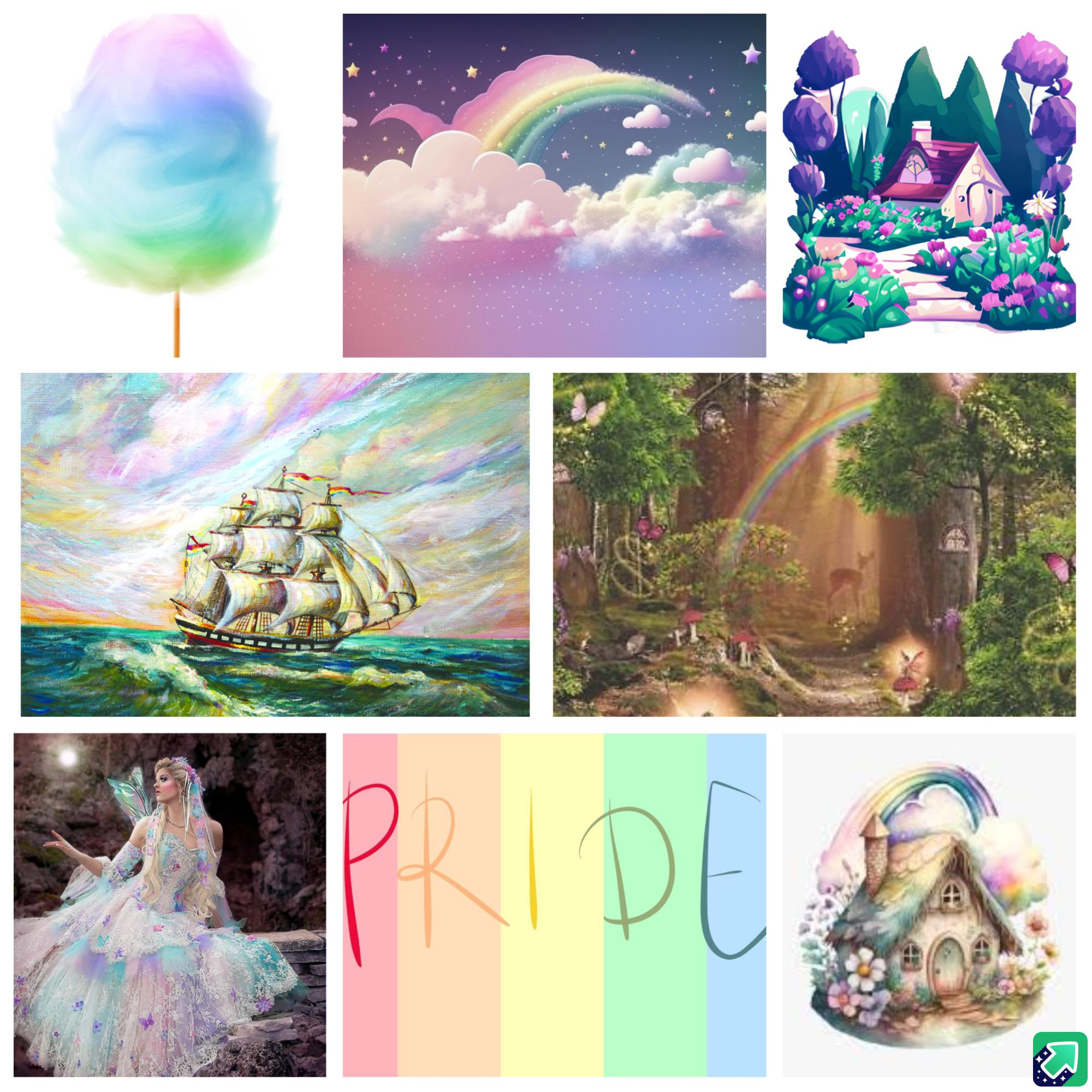 A fever dream of colorful pastels rests an open sky. A ship drifts on an open ocean, the rainbow clouds looming above. A faerie waits, gossamer wings twinkling in the morning light.