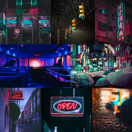 Bright lights in the crowded city. Rain falling, fog on the windows. Late wandering and wet pavements. Neon colours and pitter-patter of umbrellas.