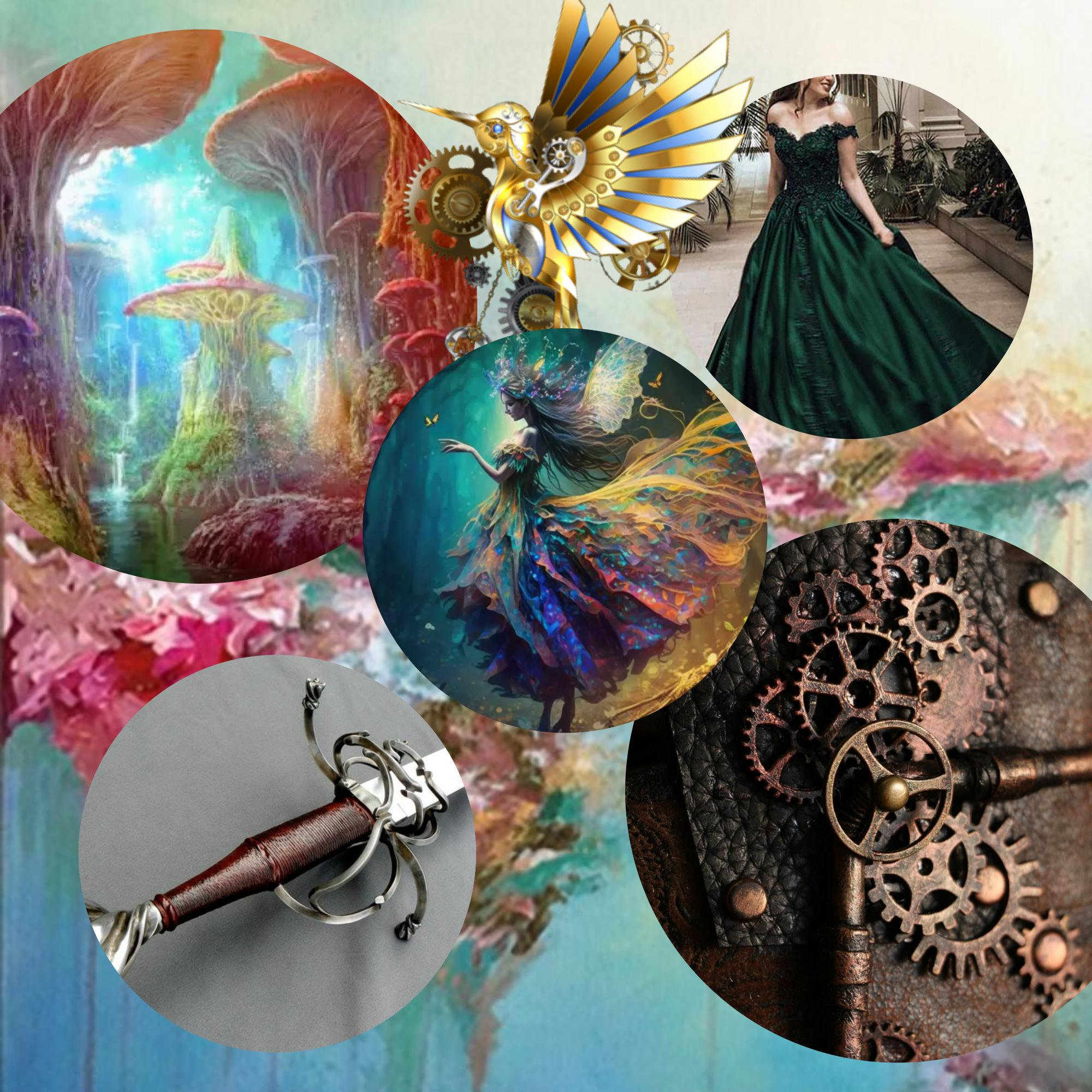 The quiet whirring of magic is overpowered by the clanking of gears. A mechanical hummingbird flies by as the strange landscape comes into view. A royal court with strange peoples, surrounded by the strange and colorful land.