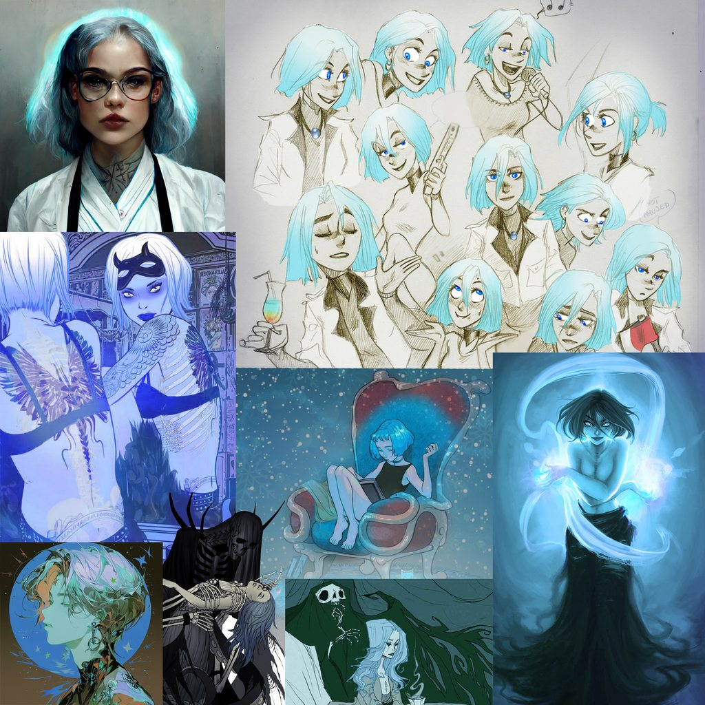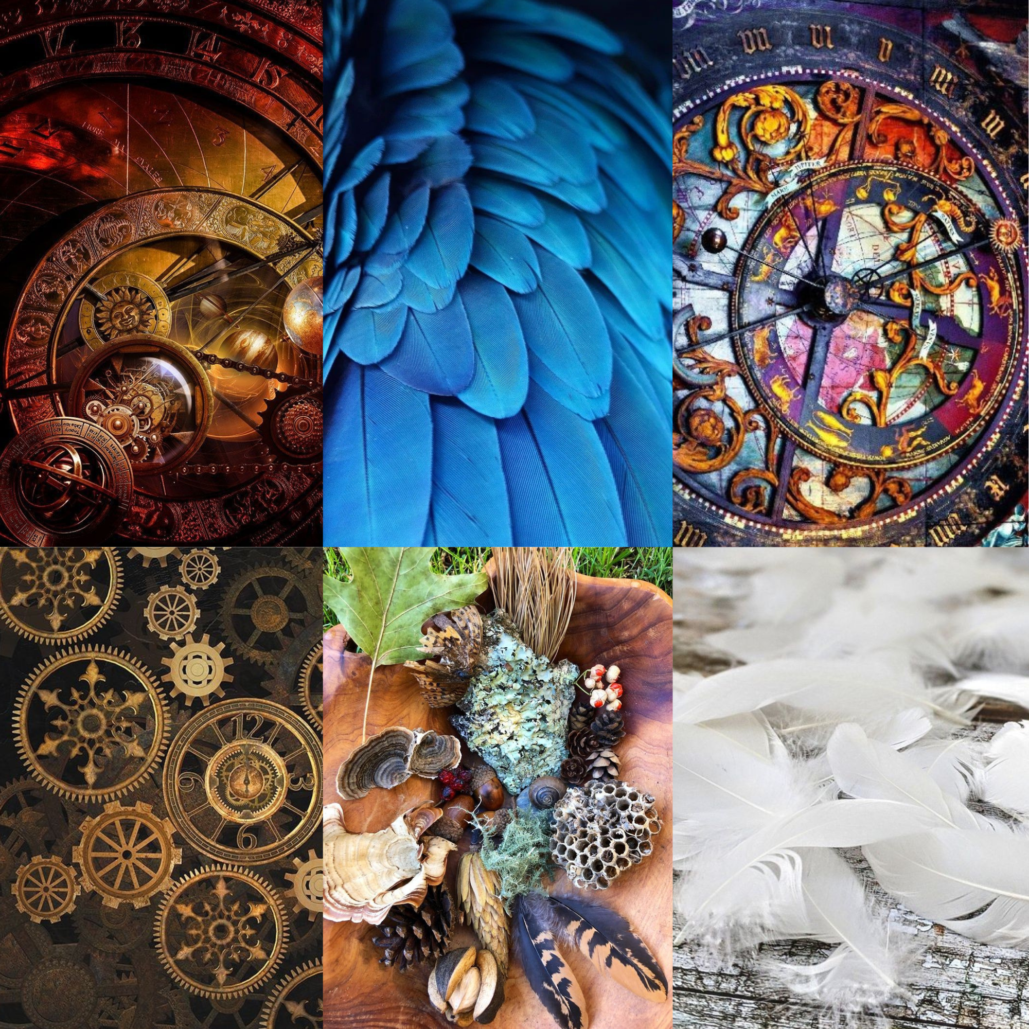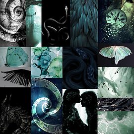 A gothic/lovecraftian mood-board rich with imagery about time, specifically a sense of futility regarding time. The color themes contain elements of a rich teal blue and a pale green sea-foam, after the character's striking sea-foam green eyes. The color themes also contain deep navy tones, as well as black. There are motives of snakes and dragons, bird feathers and wings, swirling plumes of color amid black or white contrast elements, and lost love.