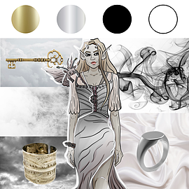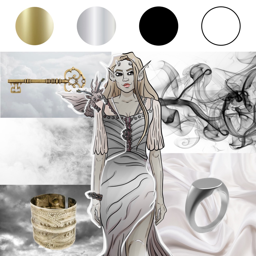 My mood board is a visual representation of my current D&D 4E character. She is a moon elf Bladesinger and a Guardian of the lost kingdom of Ilyianbruen in the Neverwinter Woods. She likes shiny rocks and trinkets and her robes and armour feature celestial decorations and gems. Her magic is mostly focused around swirling ice and shadow spells, like shadow sever and chill strike.