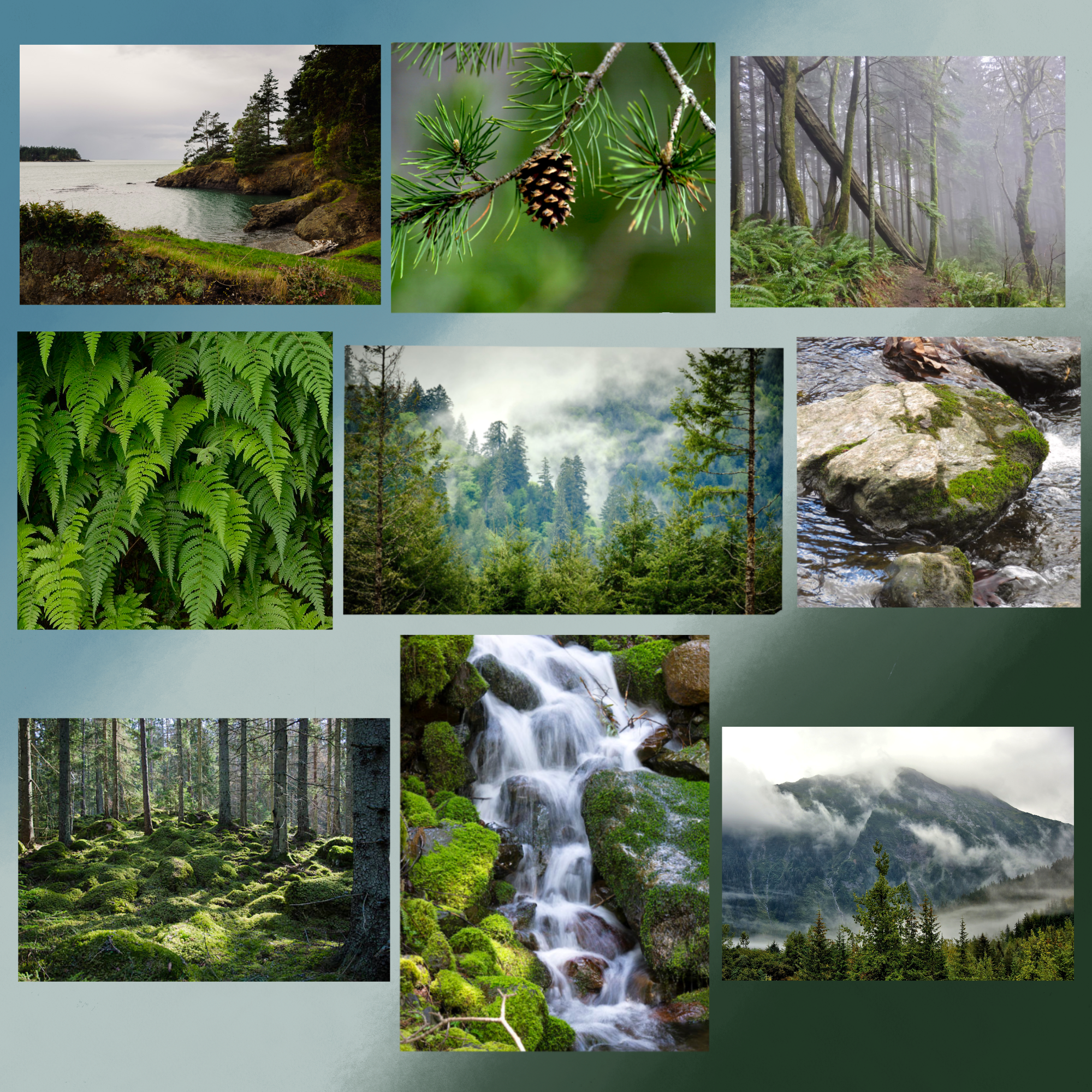Foggy mountain tops covered in lush pine forests. Green ferns and moss covered stones. Pinecones. Running streams with rolling waterfalls. Gray overcast days. Listening to the rain falling.