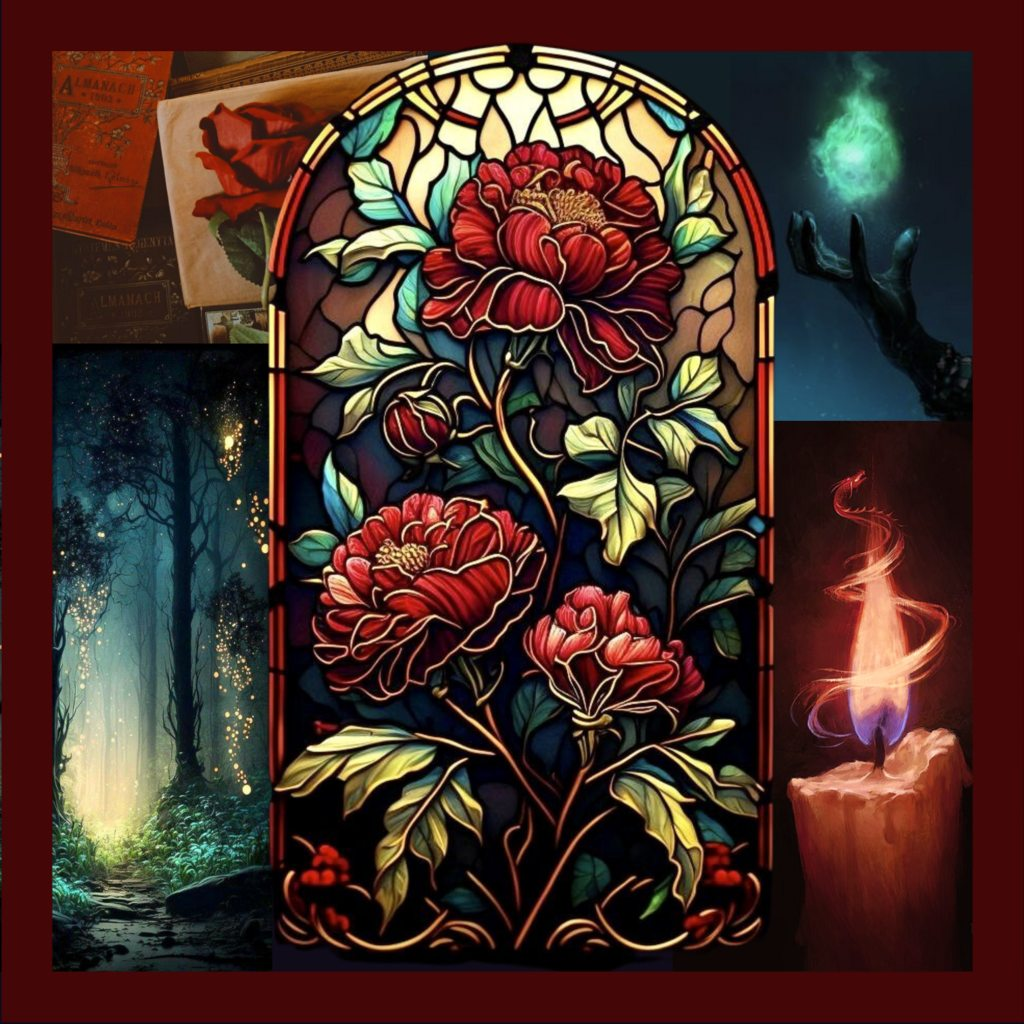 The moon was now rising over the hills behind me, waking up the sleepy creatures of the night. Small iridescent flowers & strange insects welcomed me with a song of chimes & somber chords. There a cottage sat in the heart of an overgrown rose bramble, firelight dancing within. The door had an intricately beautiful stained-glass window, with three flowers growing up towards moonlight. I stepped inside, seeing a single desk stacked high with books, where a single rose rested on an open page.