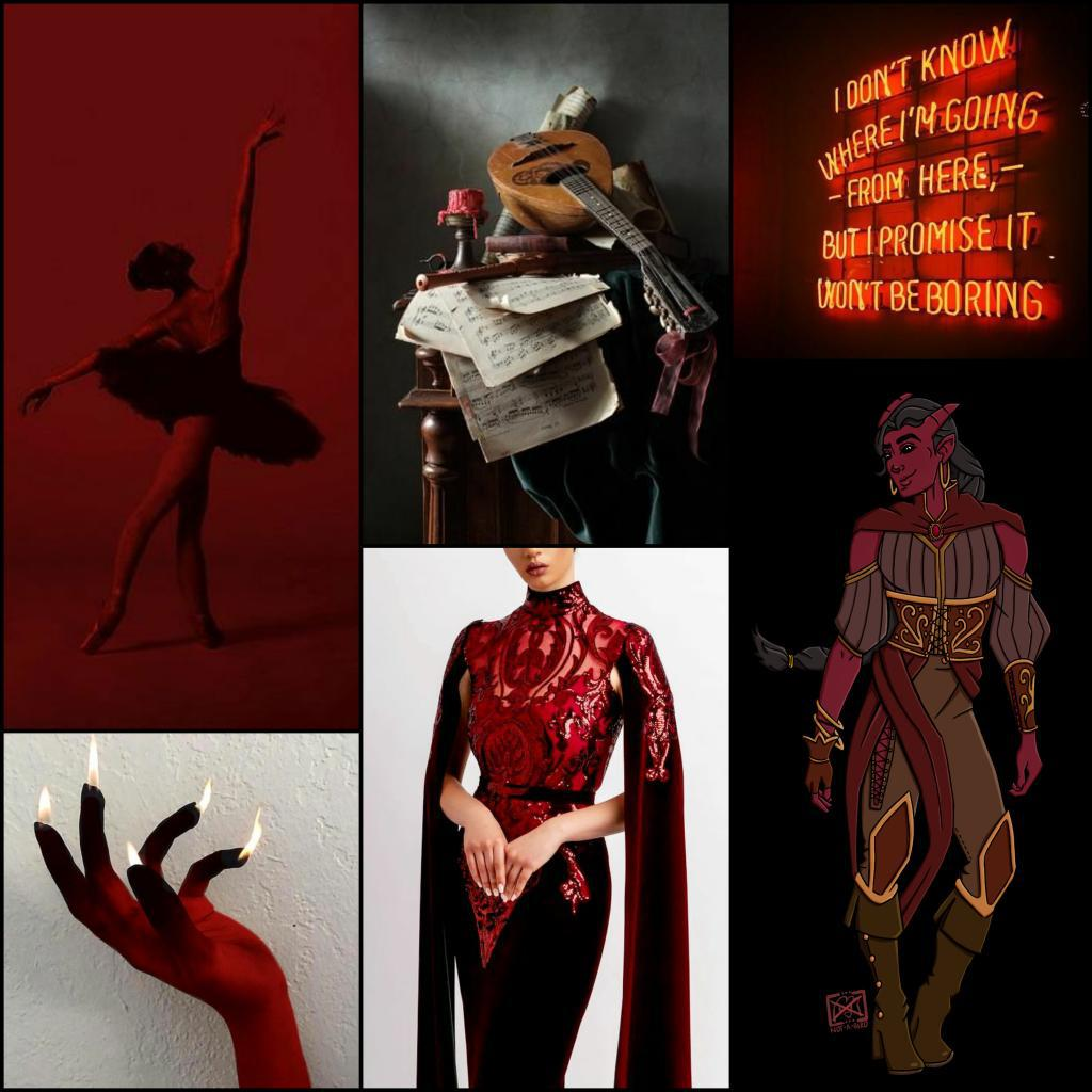 This is my little multiclassing College of Valor, Cleric of Trickery Tiefling. After fleeing her old hometown from being not accepted the way she was, she got rid of her old name and started to travel the world and tries to find her way and place. After meeting the bloodkeep diva at a "Rakdos Party", her closet got a huge stack of blood red clothing with black and gold accessoires.